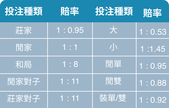 百家樂賠率表